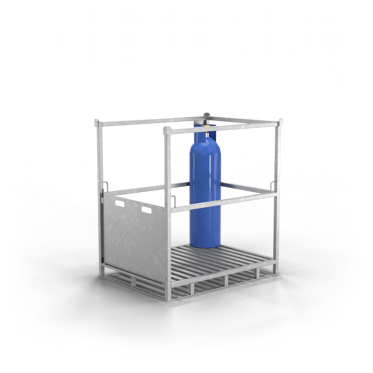 • The pallet is designed for ergonomic and safe handling, featuring four mounting strap holders and a tilting flap made of anti-slip ribbed sheet metal, making it easy to roll cylinders in and out.