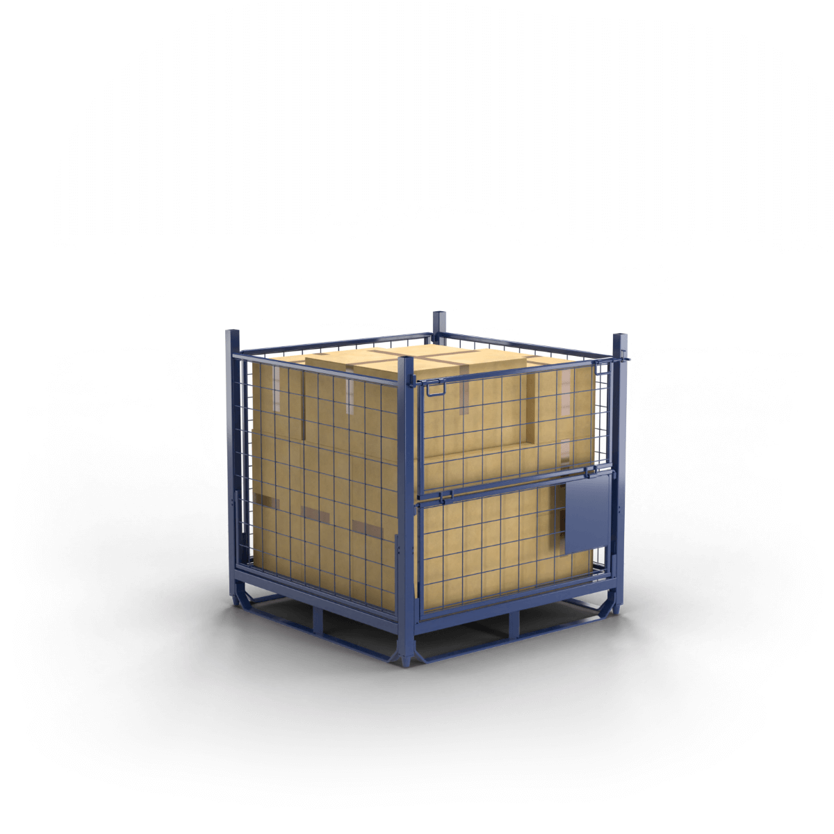 A durable steel storage basket with a 500 kg load capacity, designed for stacking up to 5 levels, creating a rack nearly 6 meters high. Its foldable construction helps save space when not in use. The dual-sided opening allows for easy access, streamlining the loading and unloading process.